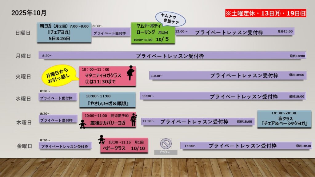 ※土曜定休日 朝ヨガ 10月5日・26日 ㈰ 7:00~8:00 レギュラー回数券 1回分 メンバー2,200円 ビジター2,500円 ヤムナ・ボディ・ローリング 10月5日 ㈰ 10:00~11:00 回数券使用不可 メンバー2,200円 ビジター2,500円 ヤムナとは? ベビークラス 10月10日 ㈮ 10:30~11:15 要メンバー登録 回数券使用不可 一回1組 1,600円 ベビークラスとは?