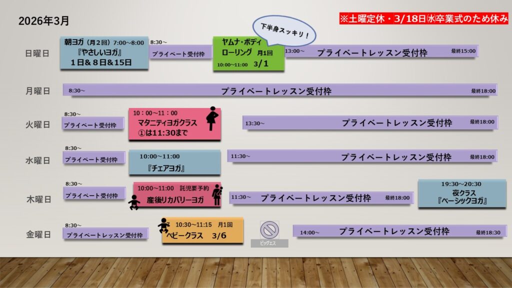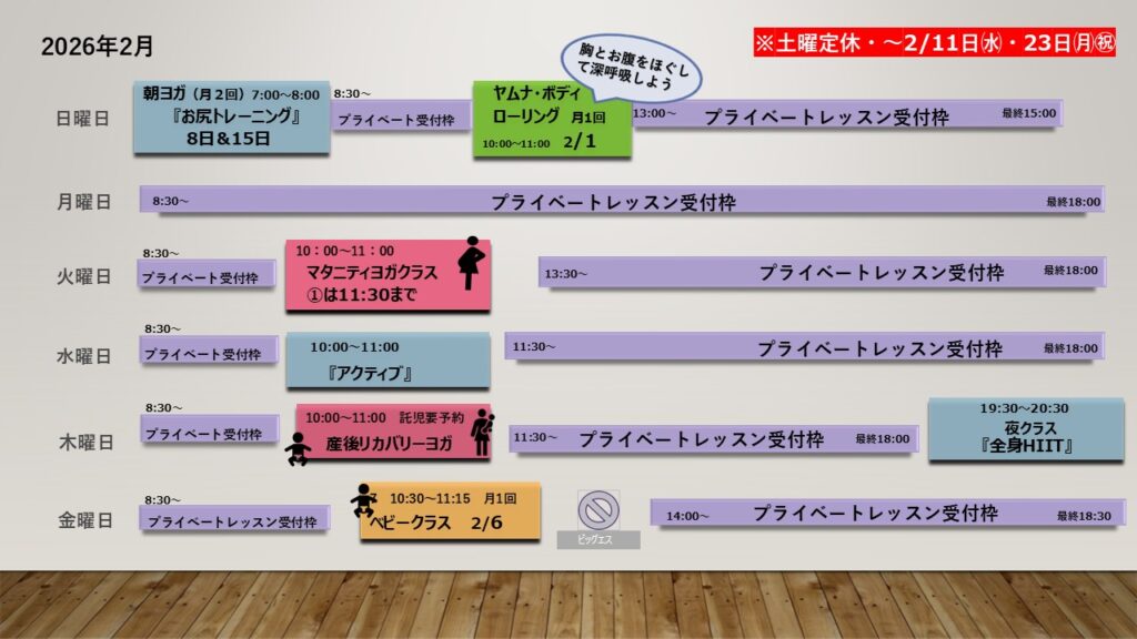 ※土曜定休日 朝ヨガ 2月8日・15日 ㈰ 7:00~8:00 レギュラー回数券 1回分 メンバー2,200円 ビジター2,500円 ヤムナ・ボディ・ローリング 3月1日 ㈰ 10:00~11:00 回数券使用不可 メンバー3,000円 ビジター3,300円 ヤムナとは? ベビークラス 3月6日 ㈮ 10:30~11:15 要メンバー登録 回数券使用不可 一回1組 1,600円 ベビークラスとは?
